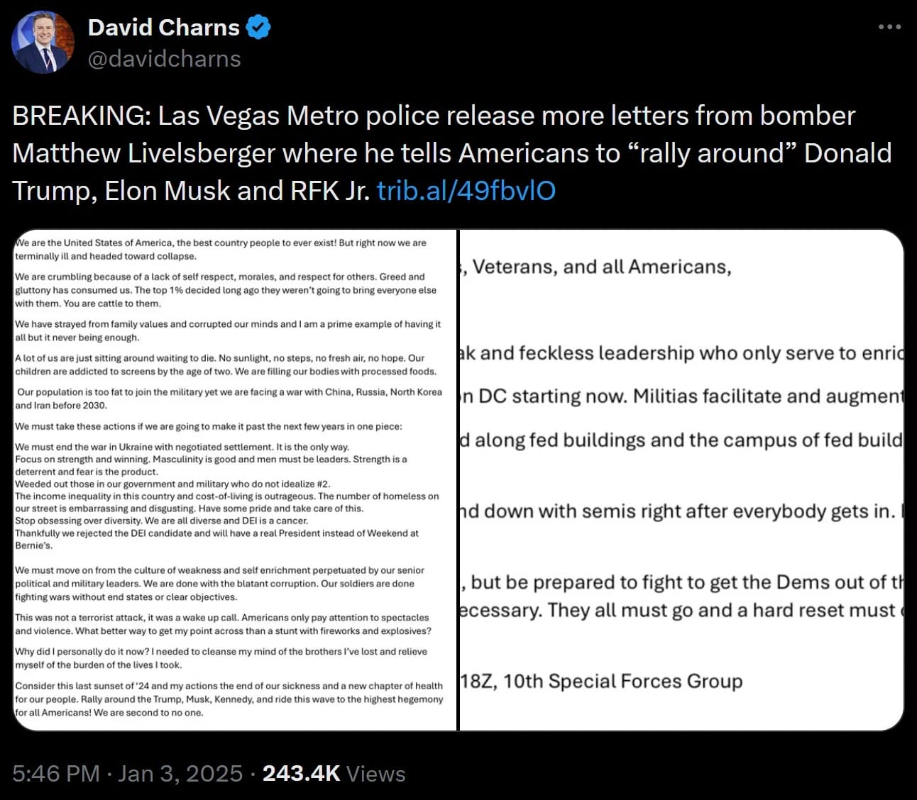 It's not just the WashPost. Did you read in the paper about the manifesto written by the guy (US born, white) who blew up a cybertruck in front of a Trump Hotel? No, you didn't. Because, as is being reported now that the story has moved off the front pages, the guy was a big fan of #KingMusk, the president-elect, and RFK, Jr. Domestic terrorism by "their" guys, apparently, is not the kind of news they want being told.